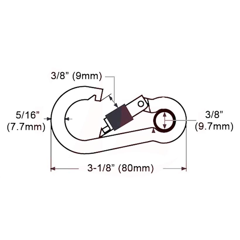 Éste mosquetón tiene un diámetro de 8mm y un largo de 80mm. Está fabricado en acero inoxidable AISI 316 forjado de alta calidad, gran brillo y contornos suaves, asegurando de que se mantenga la forma con cargas que cumplan o superen el punto de deformación (a diferencia del acero inoxidable fundido).
