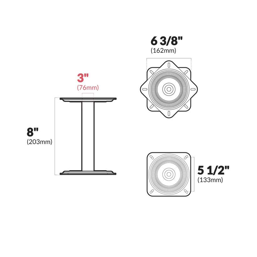 El pedestal fijo está diseñado con una base fija en la parte inferior y un plato giratorio de 360º en la parte superior, ambos con un tamaño de 165mm x 165mm (6-1/2″ x 6-1/2″) y una distancia entre orificios standard para la mayoria de las butacas. Calidad confiable y rotación de manera constante. Esta fabricado en acero laminado en caliente color negro con un altura de 203mm (8″).