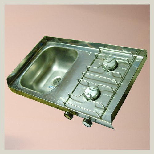 Mesada en acero inoxidable con bacha, 2 anafes y respaldo de 40 x 90
