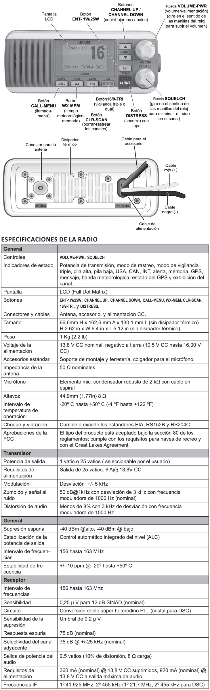 La radio VHF marina UM385 de Uniden viene equipada con un micrófono frontal robusto y brinda nuevas de características incluyendo plena capacidad DSC y alerta de emergencia climatológica. Capacidad completa de llamadas selectivas digitales clase D, incluido el envío de posición, llamada de prueba, solicitud y texto. Posee componentes compactos evaluados detalladamente y materiales compatibles con el ambiente marino.