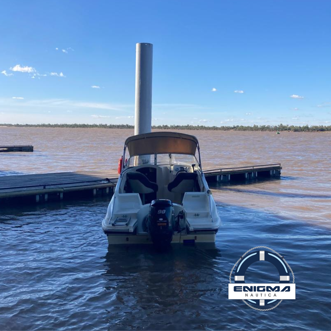 Parabrisas curvo, equipo de dirección con volante, herrajes cromados, tablero para instrumental, luces de navegación, tablero comando eléctrico, bomba de achique, posacañas, toma 12v., posavasos, butacas giratorias ergonómicas, guantera, bodegas proa y popa, piso matrizado antideslizante, planchadas de popa, tanque interno con medidor, toldilla inox, ecosonda, instrumental, escalera.